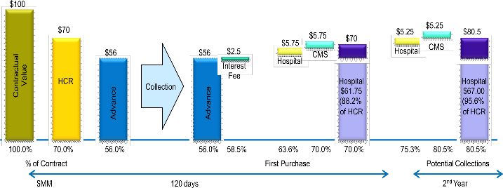 CMS agrees to purchase 100% of all clean commercial insurance claims for 1 year at up to 80% of Historical net Patient Collection Rate ("HCR")